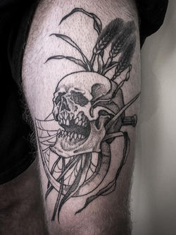 Junipers Motive sind geprägt von Natur, Mythologie und Fantasy-Welten. Am liebsten arbeitet sie detailreich in schwarz und grau. Als gelernte Grafikerin vereint Juniper ihre Affinität für Gestaltung mit ihrer Liebe für Körperkunst.